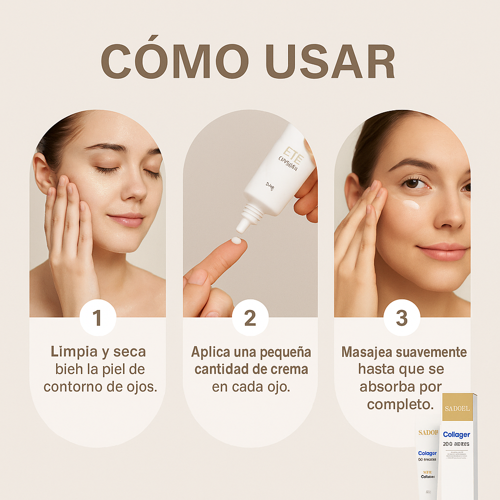 1️⃣ Aplicar una pequeña cantidad de crema en la zona del contorno de ojos, mañana y noche.
